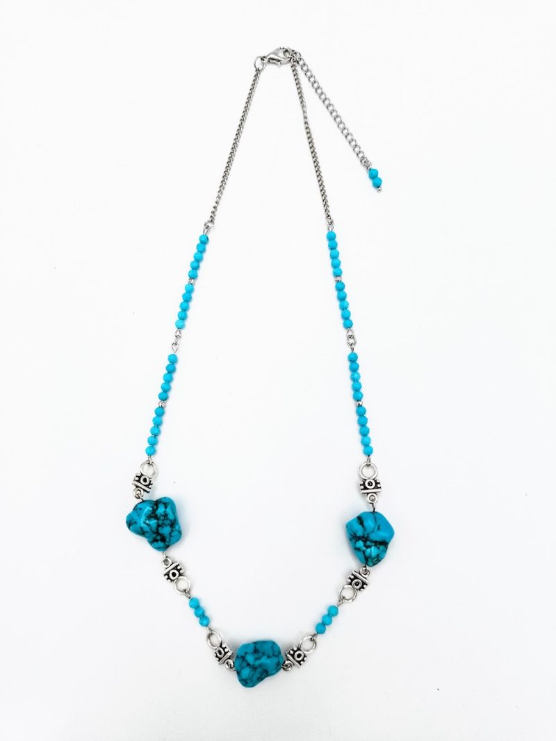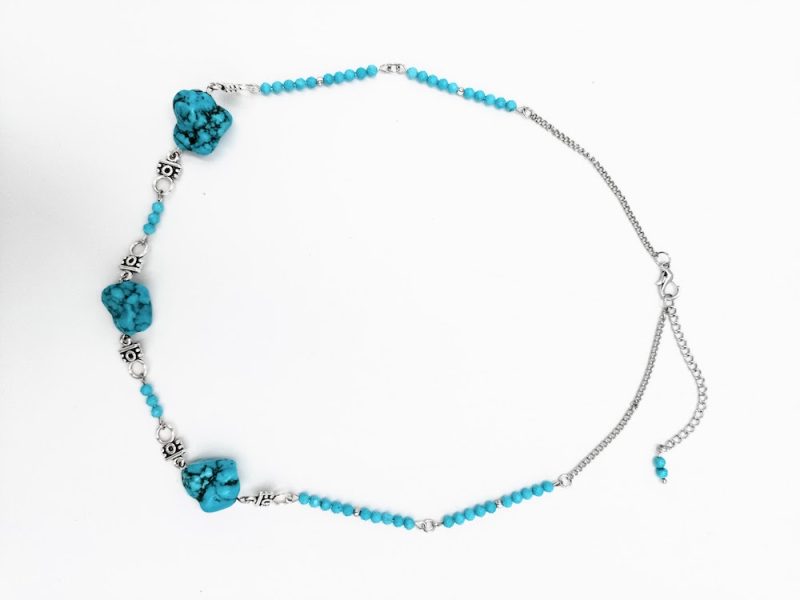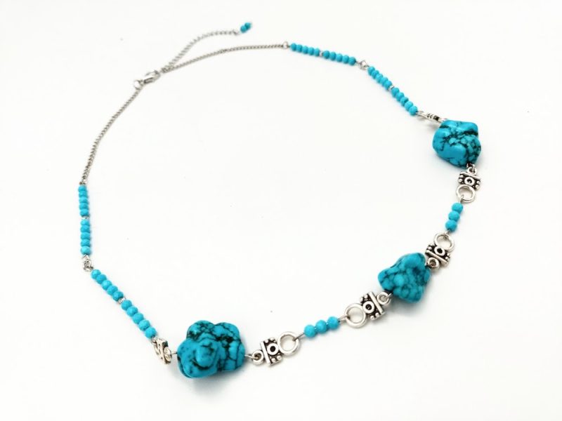Naszyjnik z turkusu, z polerowanymi koralikami i dużymi, naturalnymi kawałkami tego minerału. Ma duży poziom regulacji (47-52cm). Łańcuszek koloru srebrnego, na który całość jest nawleczona, nie ściera się pod wpływem wody ani potu.